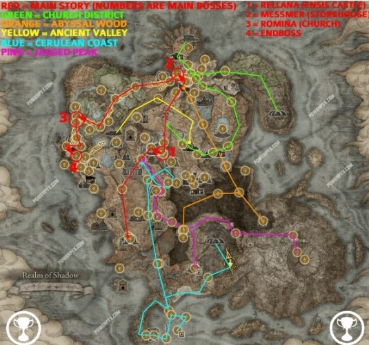 【红色路线】为主线剧情(数字为主线BOSS,1蕾拉娜-恩希斯城;2梅瑟莫-保藏库;3萝蜜娜-教堂;4最终BOSS);