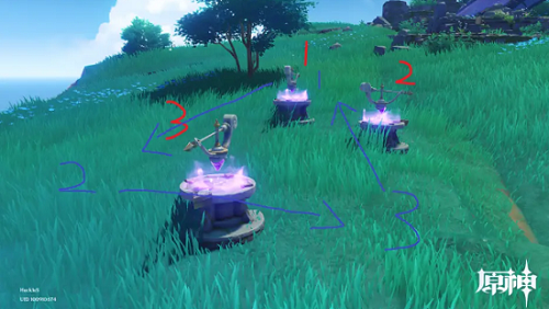 3、需要在初始雷灵抵达3号探针左侧(蓝色笔迹2号位置)时放出第二只雷灵,并控制角色站在第二只雷灵前沾染雷元素(即站在3号探针的正确位置)