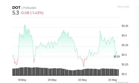 目前,Polkadot 的交易价格为5.30美元,过去24小时下跌了1.43%,但在过去7天内上涨了0.07%,因为它正在努力扭转上个月的10.51%的跌幅。