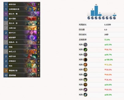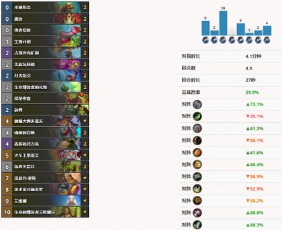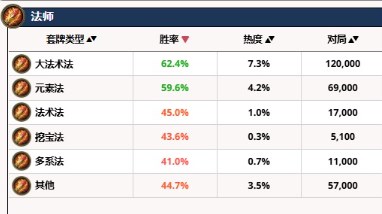 目前标准天梯最强职业,环境霸主,大法术法在12万场对局中胜率达到了恐怖的62.4,最新补丁之后对大法术法的削弱不疼不痒,所有卡组只有对阵海盗瞎劣势,另一套元素法69000场胜率达到的59.6,在快攻套牌中仅次于海盗瞎。