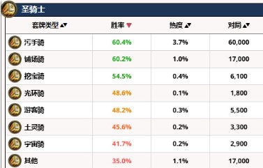 污手骑在天梯目前只在对局海盗瞎,大法术法和元素法劣势,污手骑在6万场对局中胜率达到了60.4%,污手骑在天梯中统治力仅次于海盗瞎和大法术法,面对其他职业胜率几乎都在60以上,这套卡组上手难度要比前两名卡组要高一点,但是好处在于不会像前两名卡组被早早削弱,还可以玩比较久的时间。