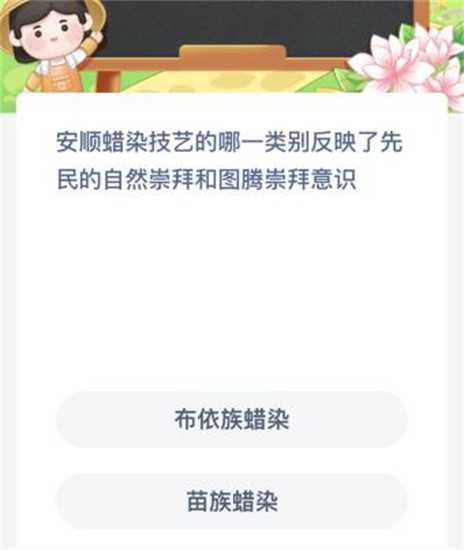 解析:安顺蜡染主要分为苗族蜡染和布依族蜡染。前者图案包括古老传说和原始认知等,反映了古代先民的自然崇拜和图腾崇拜意识。后者纹样多为自然元素,表现了人们对宇宙的认知、对自然山川的崇敬和对美好生活的追求向往。