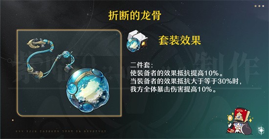 解析:套装效果常态提高效果抵抗,可以降低阮梅被施加负面效果的概率,如果效果抵抗达标则获得一个全队暴伤光环效果,并且多套可以叠加。龙骨套装自带10%抵抗,阮梅还需要再堆20%抵抗来触发效果。这对于有高额击破特攻词条需求的阮梅来说无疑是雪上加霜的,对有效词条数目的要求会变得更高。