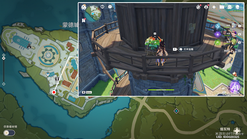 来到蒙德城传送点东南侧,前往如图位置,在猎鹿人餐馆后方取得宝箱四。