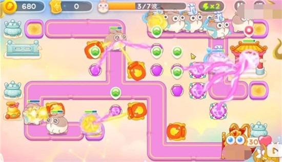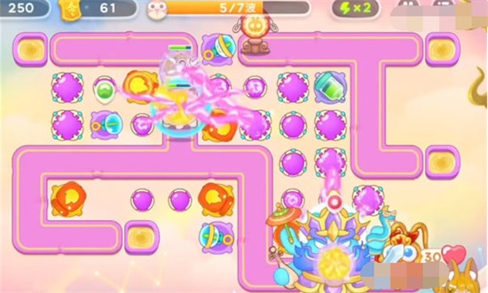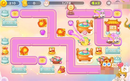 2、清理掉多余障碍物后,在地图中间建造魔法球炮塔,先后锁定桃子篮、青铜鼎等障碍物,清理掉后建造魔法球补位。