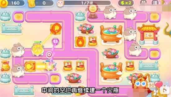 1、开局我们先从地图左下角起手,建造两个火瓶升到满级,锁定右边的桃子篮输出。