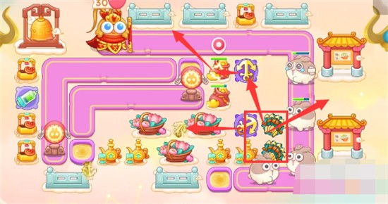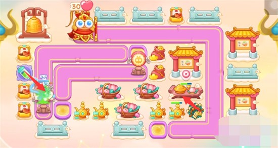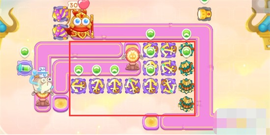 3、开完第一个道具之后放置第二个多重箭,如果漏了跑车兔就不给第二个多重箭升满级,在萝卜后方放置一个导弹即可。
