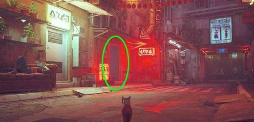 离开服装店后左拐,找到下图所示的红色霓虹灯,走楼梯下去,进入最里面。
