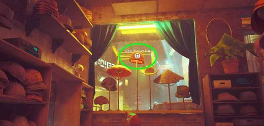 跟着机器人走,来到路对面的帽子店前。一般情况下,门口的店员会将我们拦下来,所以无法直接进去,只能寻找其他方法。