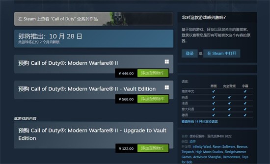 使命召唤19现代战争2多少钱呢,很多喜欢使命召唤这个系列的游戏的玩家都是从现代战争系列开始入坑的,尽管被誉为美国CF,但是使命召唤的游戏的剧情素质算是在枪战fps数一数二的,因此在使命召唤19预告一出来后很多玩家都非常期待想知道价格,下面就是使命召唤19现代战争2steam价格介绍的内容。