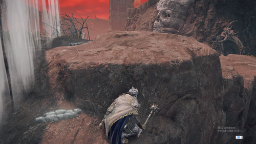 上图所示,在悬崖边靠近白色幕墙的地方有一个小台阶,这个小台阶可以让游戏角色蹲在上面。