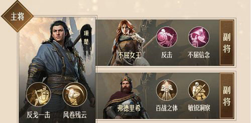 反击枪的核心主将是项羽,第二个人物则是不屈女王,最后补一手弗德里希。这三位都是枪兵种,放一起战斗风格上都是有加成的,通过天赋还有双倍的提升。