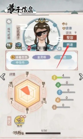 2.然后点击上面的驱逐就可以把这个弟子给驱逐掉。