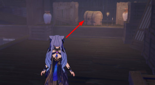 7、拿到第一个宝箱之后,继续跳下去,就可以在拉闸机关对面位置看到第二个宝箱了,只需要打开机关,然后等爬梯下降,然后从机关往箭头方向绕过去就可以拿到宝箱了。
