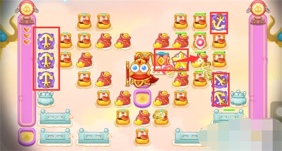 4、然后继续在两侧放置船锚,可以全部拉到二级,中间继续清下方的钱袋。