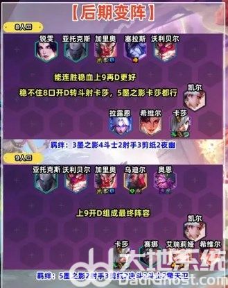 3、后期到9级之后开始找刀妹,给上关键装备,最后刀妹二星阵容即可大成。
