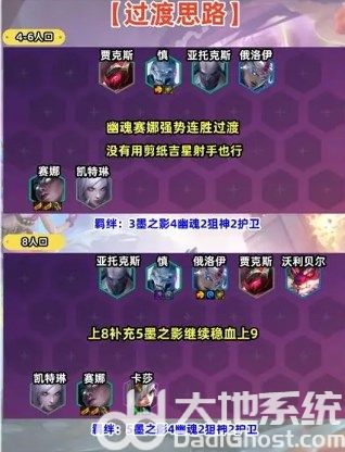 1、前期可以使用幽魂赛娜来进行国服,主要打连胜,这套阵容的核心是刀妹,五费卡需要九级才能成型。