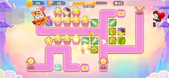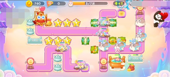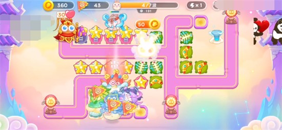 3、在右下角放鱼刺抽空清理道具,还是第三波之前清理完道具,之后会有神仙,玩家在中间位置补一些鱼刺+星星塔,基本每一波都会有会飞的兔子;