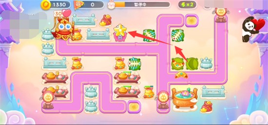 1、开局在右侧的下方放回旋镖,锁定左侧中间的钱袋打,前期会有粉兔,稍微锁一下头,把中间上方道具清掉之后放星星塔和鱼刺,右侧钱袋打掉放鱼刺+回旋镖;