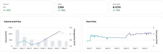 而不少 PEPE 持有者也在获利后表示将利润用于购买 Milady,这也导致近期其 NFT 价格飙升。 OpenSea 资料显示,截至 5 月 8 日,Milady 的交易量超 3.3 万ETH,持有地址数超 3300 个,地板价为 4.1 ETH,而铸造价仅为 0.06 ETH。过去 7 天,Milady 的交易量上涨 1117% ,地板价上涨约 47% 。
