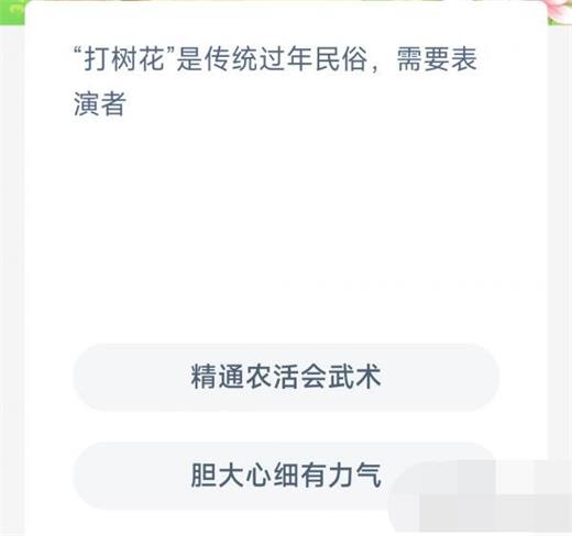蚂蚁新村1月21日今日问题打树花是传统过年民俗需要表演者?蚂蚁新村通过 每天签到回答问题可以让自己的村庄建设的更加快捷,并且里面获得的木兰币积累到一定的数量还可以用于公益事业,小编为小伙伴带来了蚂蚁新村小课堂今日答案最新1月21日,正确答案选择胆大心细有力气,打铁花是将熔化的铁水泼洒到古城墙上,非常考验表演者技术。