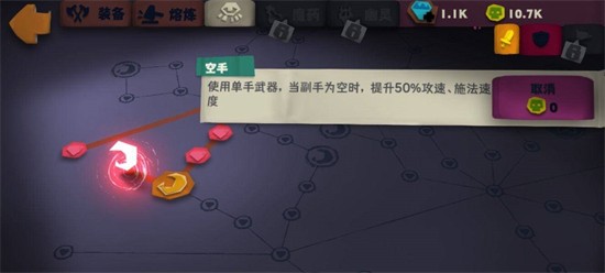 4.玩家在点完3个核心防御天赋后,点攻击天赋。第一个点出“空手”,就算是不带护盾,也能够提升悬浮刃的旋转速度