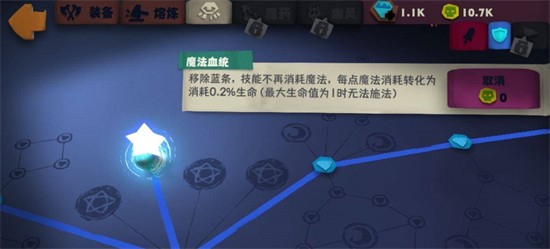 2.第二个核心天赋点出“魔法血统”,这样一来,玩家消耗蓝,就变成了消耗血量,血量又处于不断恢复过程中,大大提升能力