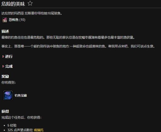 3:接下来玩家再来到冬拥湖,在冬拥湖玩家可以钓到10条任务所需的恐怖鱼。再把10条恐怖鱼带回达拉然的玛西娅·切斯这里交任务就可以了。