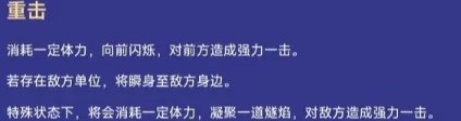 2、重击:消耗一定的体力向前闪烁,凝聚一道火焰,向敌方造成强力一击。