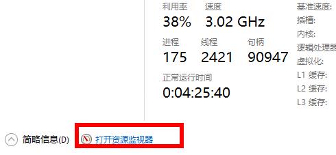 2、然后点击上面的CPU,然后点击下面的“打开资源监视器”