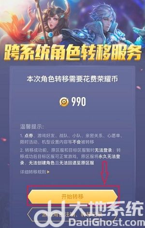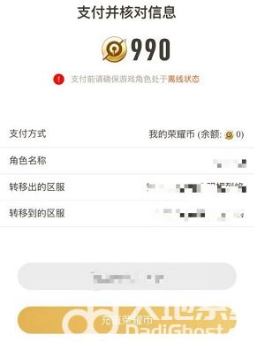 6、充值990荣耀币进行支付,角色处于离线状态即可从安卓转移至苹果。