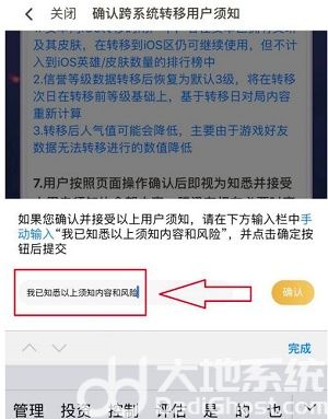 5、仔细阅读跨系统转移用户须知,在下方收动输入【我已知悉以上须知内容和风险】,点击确认;