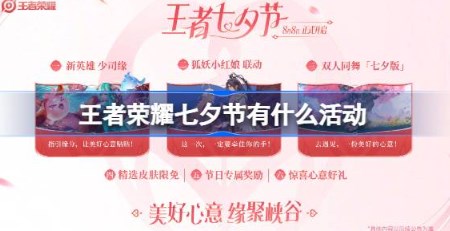 王者荣耀七夕节有什么活动?王者荣耀是一款支持多人在线组队的热门角色扮演游戏,在游戏中除了有丰富的对战玩法,还会有各种限时活动的上线,在本次即将到来的七夕节中,游戏为玩家们准备了全新的七夕主题活动,在这次活动中不仅是可以有机会获得全新皮肤,还可以开启全新双人互动玩法,本次就让小编来为大家介绍一下在今年的七夕节活动都有什么内容。