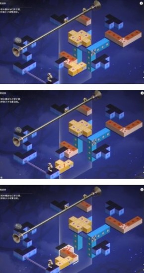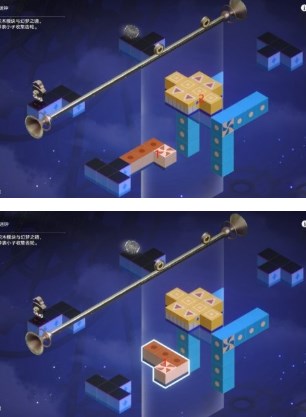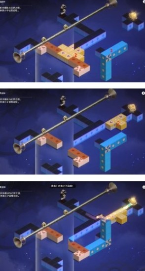 3、移动3号黄色积木至右侧所示位置,点击2次2号橙色L形积木,再向左推移3号黄色积木。