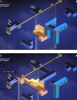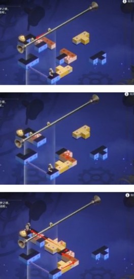 3、点击三下2号蓝色L形块,对准图示角度,并将镜面拉至右侧极限,随后移动3号黄色滑块至右侧尽头,此步完结。