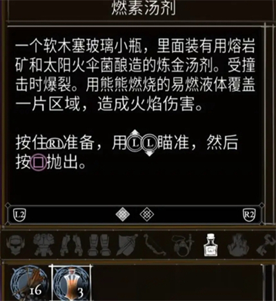 一个软木塞玻璃小瓶,里面装有用熔岩矿和太阳火伞菌酿造的炼金汤剂。受撞击时爆裂。用熊熊燃烧的易燃液体覆盖片区域,造成火焰伤害。