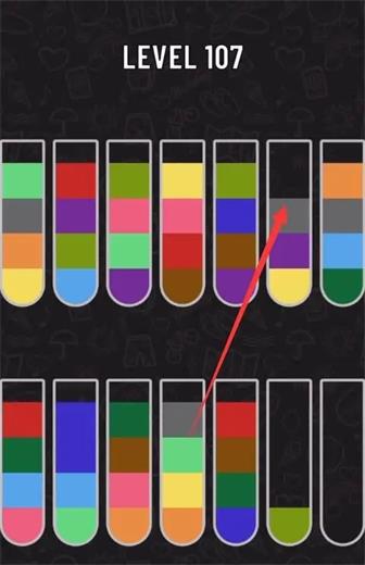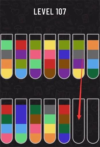 水排序拼图这款游戏非常的新颖好玩,采用竖屏的方式,能够让玩家爱不释手,超过了几百个关卡玩家可以自由的选择进行闯关,很多玩家卡在了107关,不清楚水排序拼图107关怎么过,这一关里面我们主要从收集灰色元素开始,首先我们可以将第一排倒数第二个试剂倒在空的瓶子里面,然后按照小编下文的方式进行操作即可。