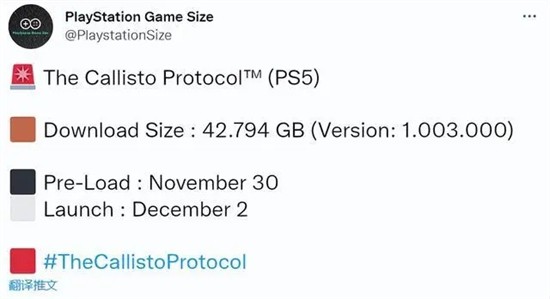 作为12月开篇之作,科幻恐怖游戏《木卫四协议(The Callisto Protocol)》将于本周五(12月2日)正式发售。据推特用户@PlaystationSize消息,PS5版《木卫四协议》容量约为42.794GB(1.003.000版本),并将于11月30日开启预载。