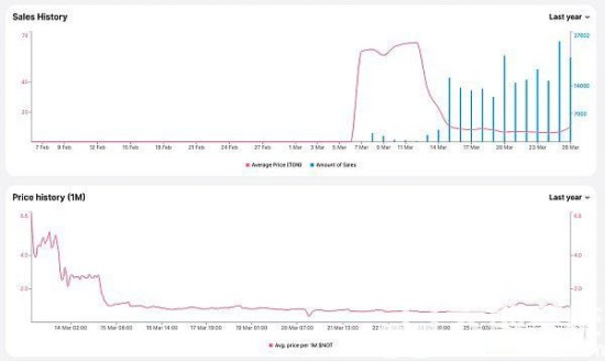 3月初,Notcoin允许精英玩家将大量游戏内货币转换为NFT代金券,这些代金券可以在其代币正式发行之前进行交易。数据显示,Notcoin NFT约有50万个在流通,价值为一张10M=9TON(按5U计算),市值约为2250万美元,总交易量为200万TON,交易额约为1000万。成交最高价出现在3.13日10M=66TON,最低价出现在3.20日 10M=3.7TON。
