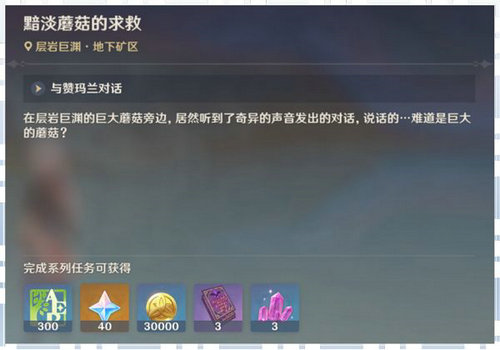 Npc为大蘑菇:赞玛兰,任务详情如下:奖励为:300经验+40原石+30000摩拉+3大经验书+3大锻造石