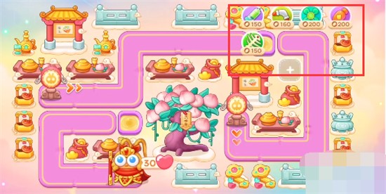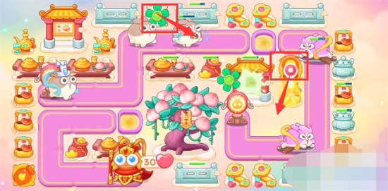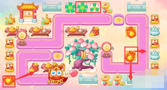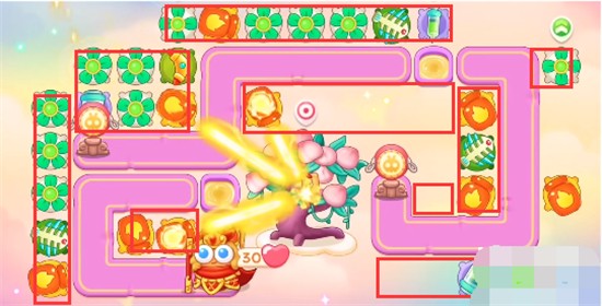 1、本关能够使用的炮塔是:毒针、风扇、回旋镖、火瓶、鱼刺,这一关我们选择风扇开图火瓶输出。