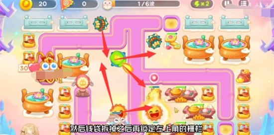 2、先把右侧的钱袋打掉,在中间左侧位置再补一个太阳,之后就可以往右侧清理了,先清理右上角的道具,放几个多重箭清理就可以,在左下角位置可以继续补太阳,注意会有小偷兔,最右侧可以放瓶子炮来清理;