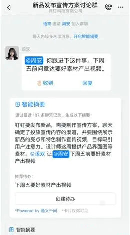 而钉钉接入“通义千问”测试之后,可以自动生成工作方案,也可以在会议纪要后自动生成总结和待办事项。比如当被拉入一个新群聊,钉钉可基于群内此前的聊天内容,自动生成聊天摘要,帮助用户快速了解上下文,再也不用手动爬楼,群聊聊到共识动作,还能自动生成待办。