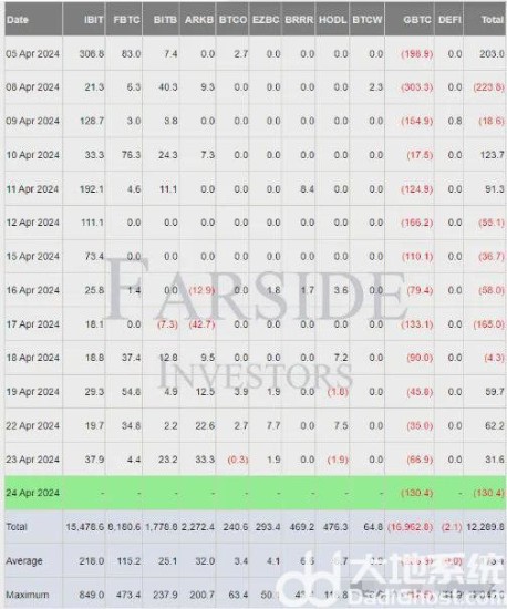 今天会是一个转折点吗?这不,4 月 24 日,GBTC 净流出 1.304 亿美元。这意味着与前几天相比,其他 ETF 的入场数量将显着增加。考虑到现货市场的销售情况,贝莱德和其他ETF投资者的风险偏好可能并未增加。