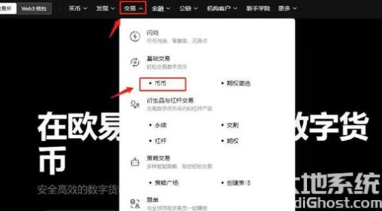 7、点击上方导航栏的【交易】——【币币】