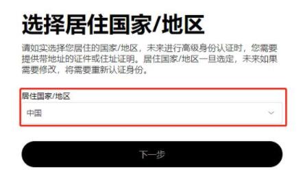 4、选择居住国家/地区,点击【下一步】