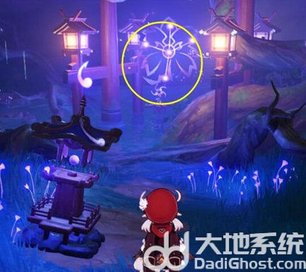 3、这时候出现封印图案,如图中圈圈位置,我们所在的灯柱为最下方的点位。