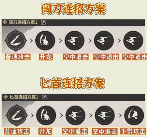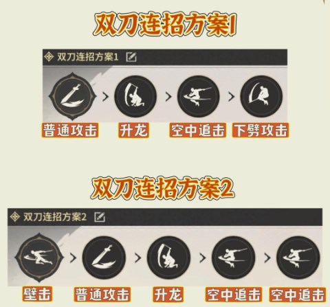 双刀:双刀连招方案1:普通攻击-升龙-空中追击下劈攻击;双刀连招方案2:壁击-普通攻击-升龙-空中追击,双刀的快速攻击节奏,让敌人措手不及!
