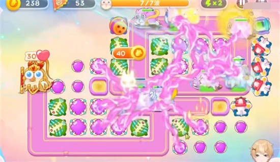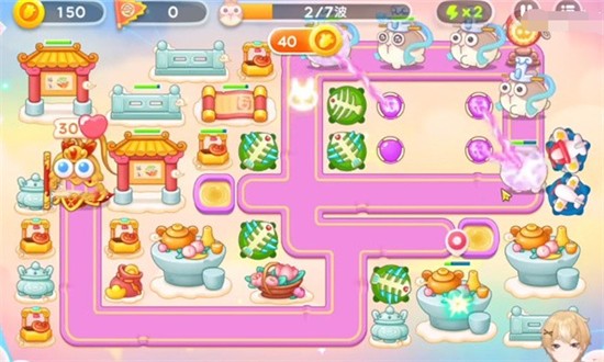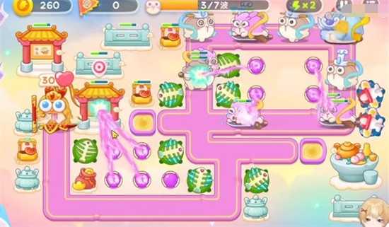 3、第三波开始我们的首要任务就是清除障碍物,多建造魔法球进行输出障碍物,优先将所有的天门进行清除然后攻击钱袋子进行攒钱。