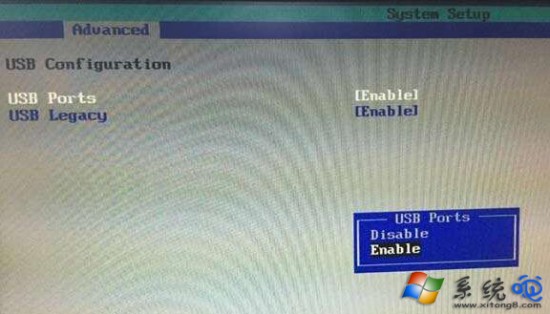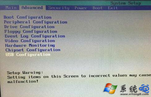 2、在BIOS设置中打开Advanced项,在下面找到USB configuration。